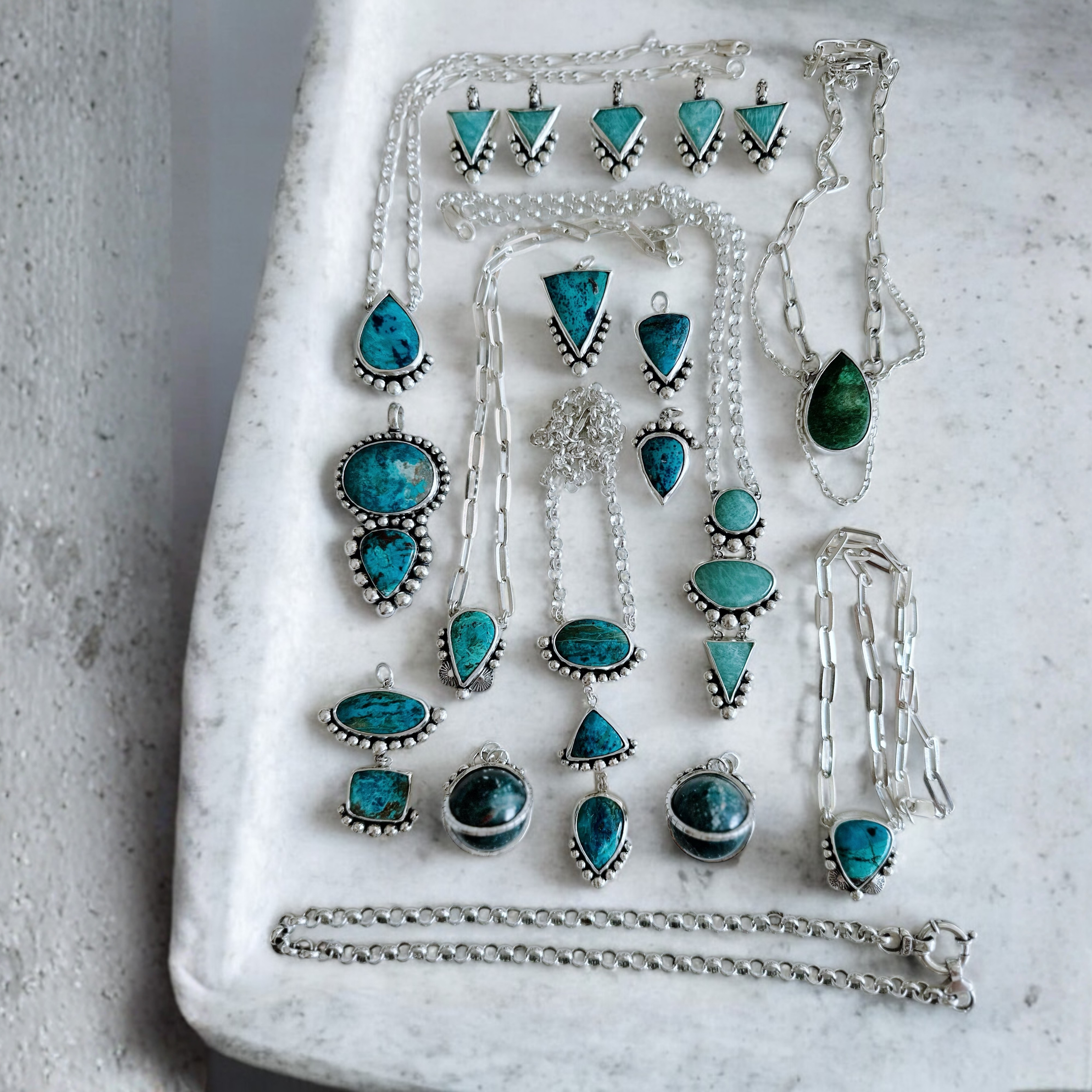 Trabajamos principalmente con plata 925 y 950. Nuestras cadenas son de plata 925, y también utilizamos plata 800 con enchape de rodio para algunas de nuestras cadenas, buscando siempre equilibrio entre durabilidad, estética y carácter.